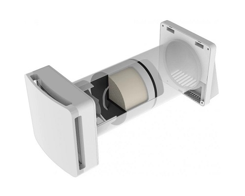 Проветриватель состоит из реверсивного вентилятора с электродвигателем, керамического рекуператора (эффективность до 93%), наружной, внутренней декоративной панелей.