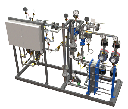 В состав блочного теплового пункта входит следующее оборудование: теплообменники, трубопроводная запорная, регулирующая и предохранительная арматура, щиты электроуправления и КИПиА, насосы, приборы для визуального контроля работы оборудования (КИП), узлы учета тепла, электроэнергии, водопроводной воды и др.
